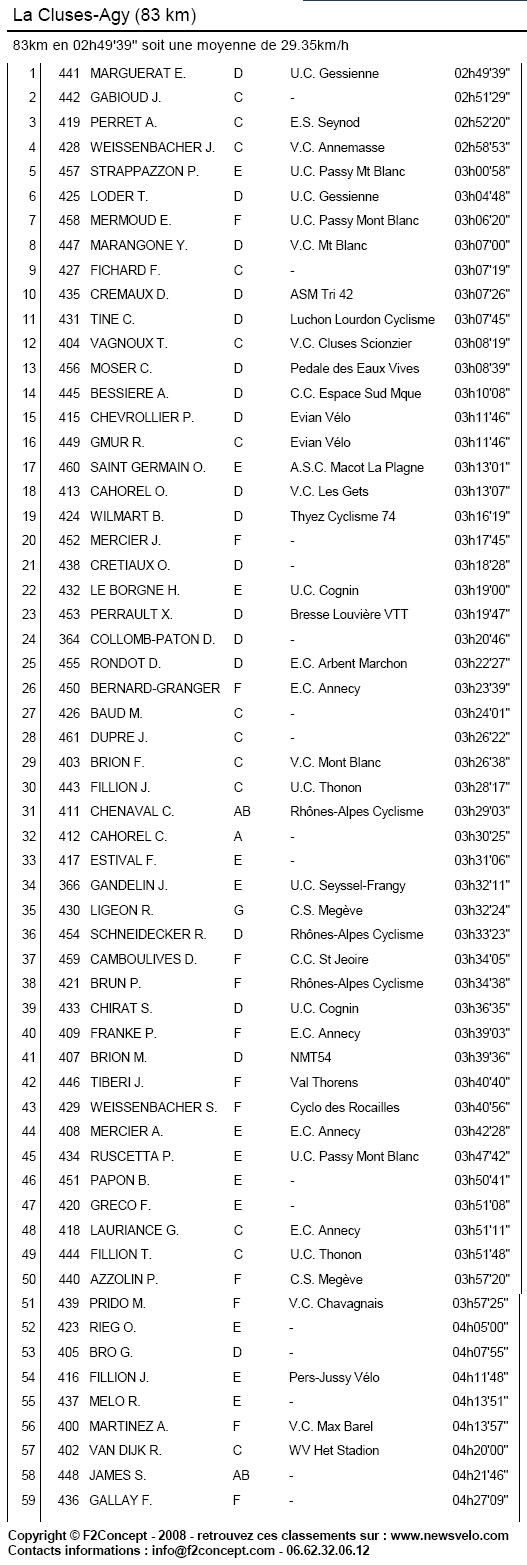 Résultats LA CLUSES AGY - 83 KMS