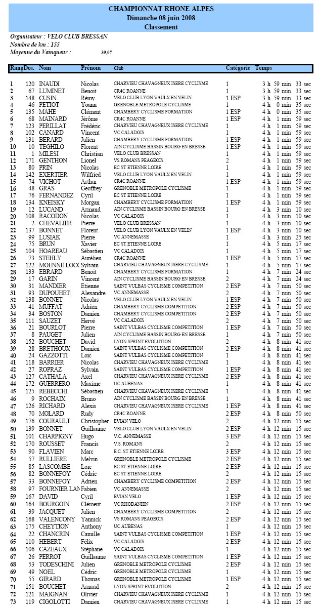 Résultats CHAMPIONNAT RHONE ALPES ROUTE