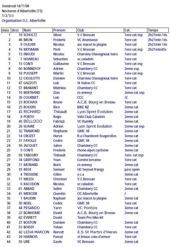Résultats NOCTURNE D'ALBERTVILLE