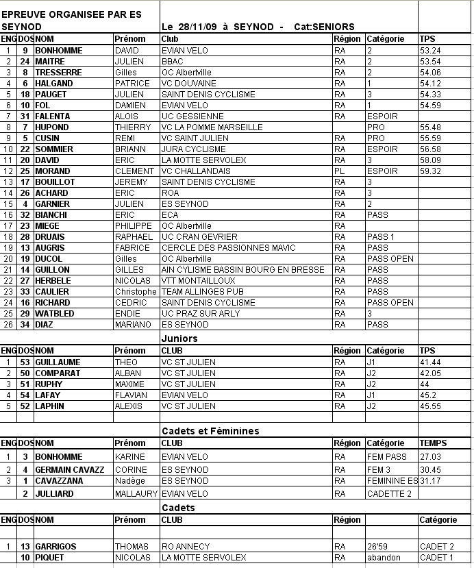 Résultats CYCLOCROSS DE SEYNOD