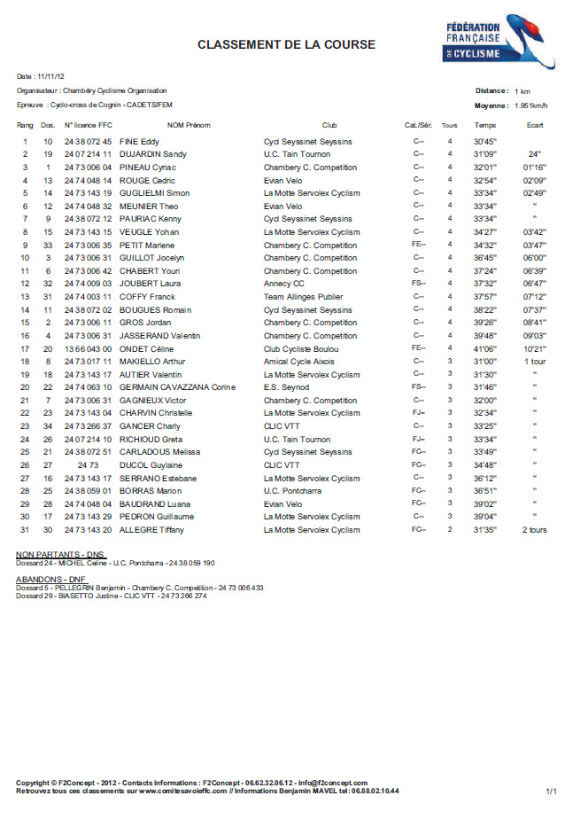 Résultats CYCLOCROSS DE COGNIN