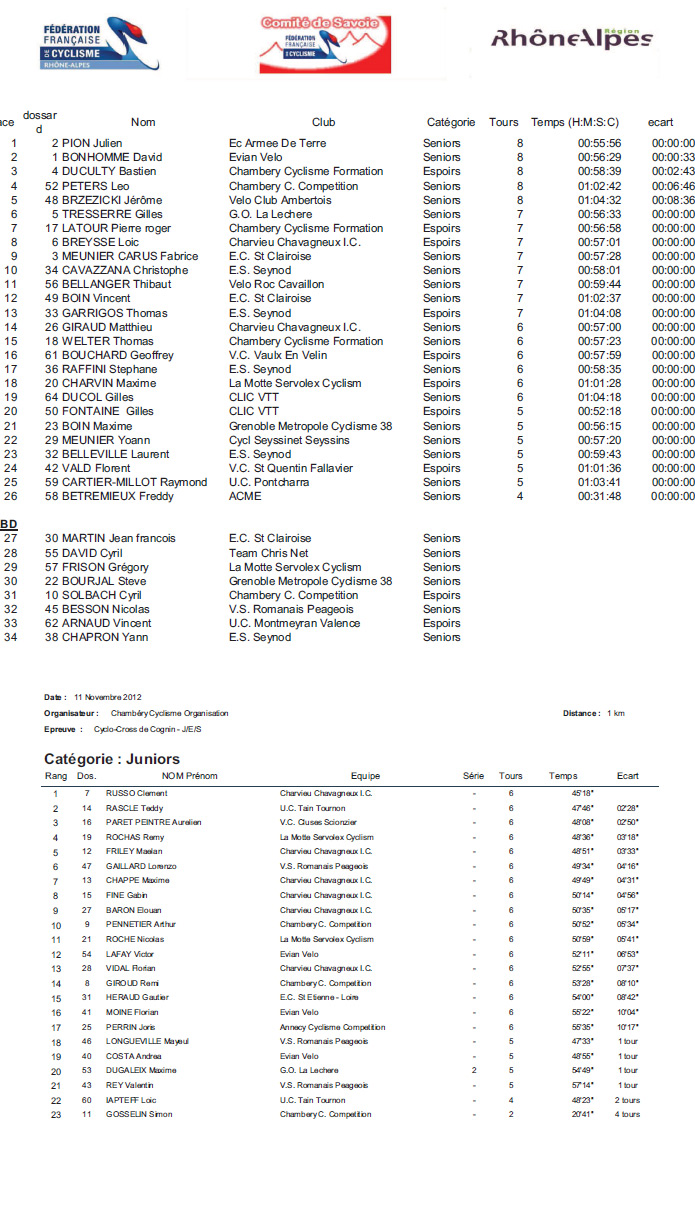 Résultats CYCLOCROSS DE COGNIN