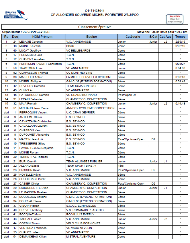 Résultats GP ALLONZIER LA CAILLE - SOUVENIR MICHEL FORESTIER