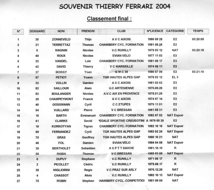 Résultats SOUVENIR THIERRY FERRARI
